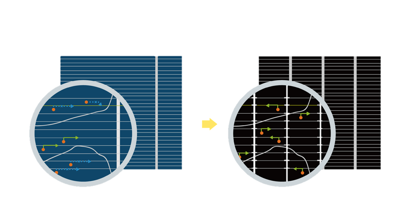 • 结合半切电池,降低遮阴影响、提升模组抗隐裂能力、并减少电阻损耗,进一步提升模组发电效能。